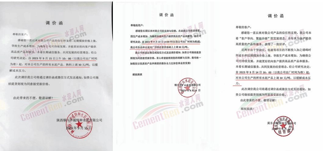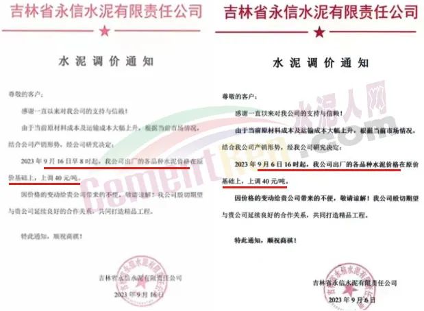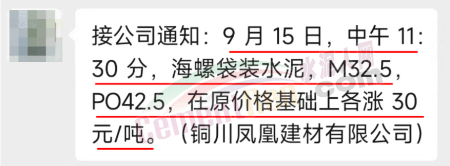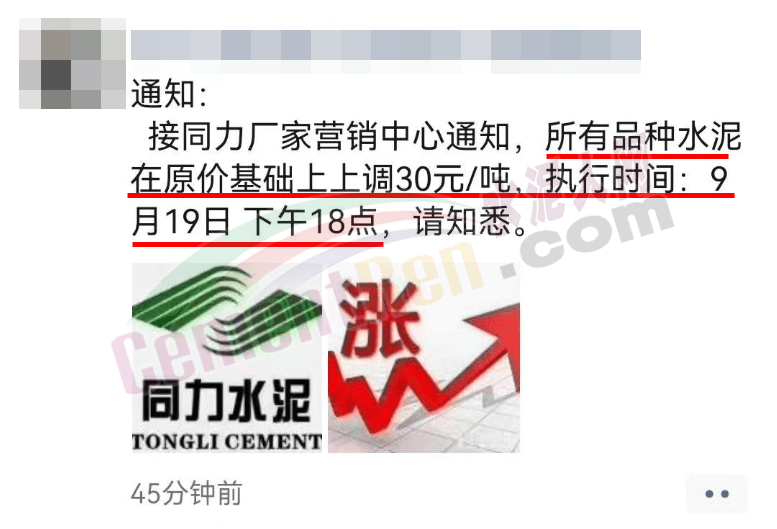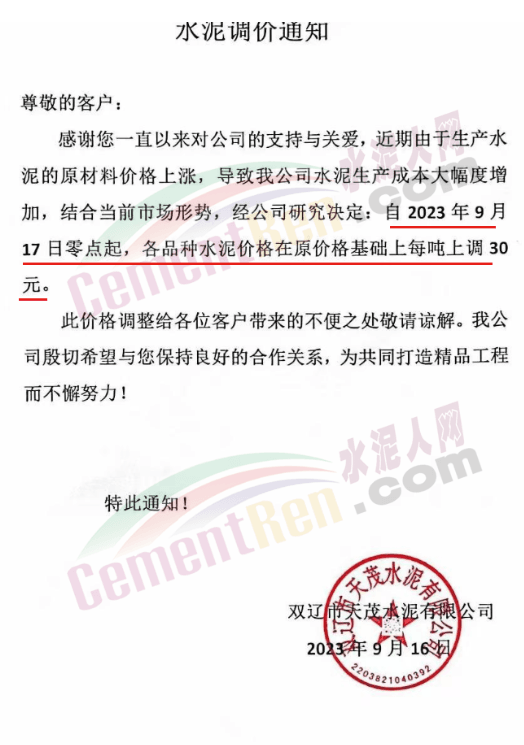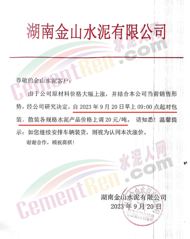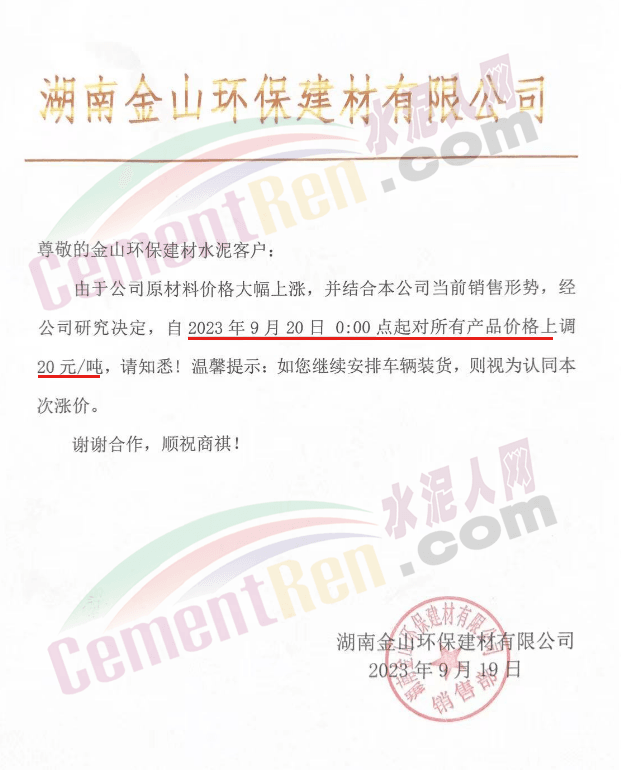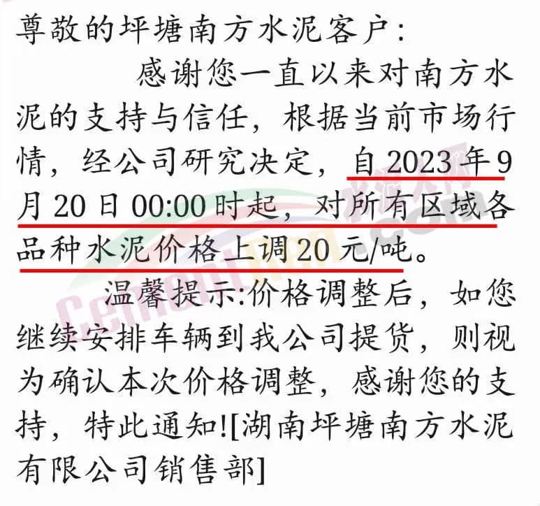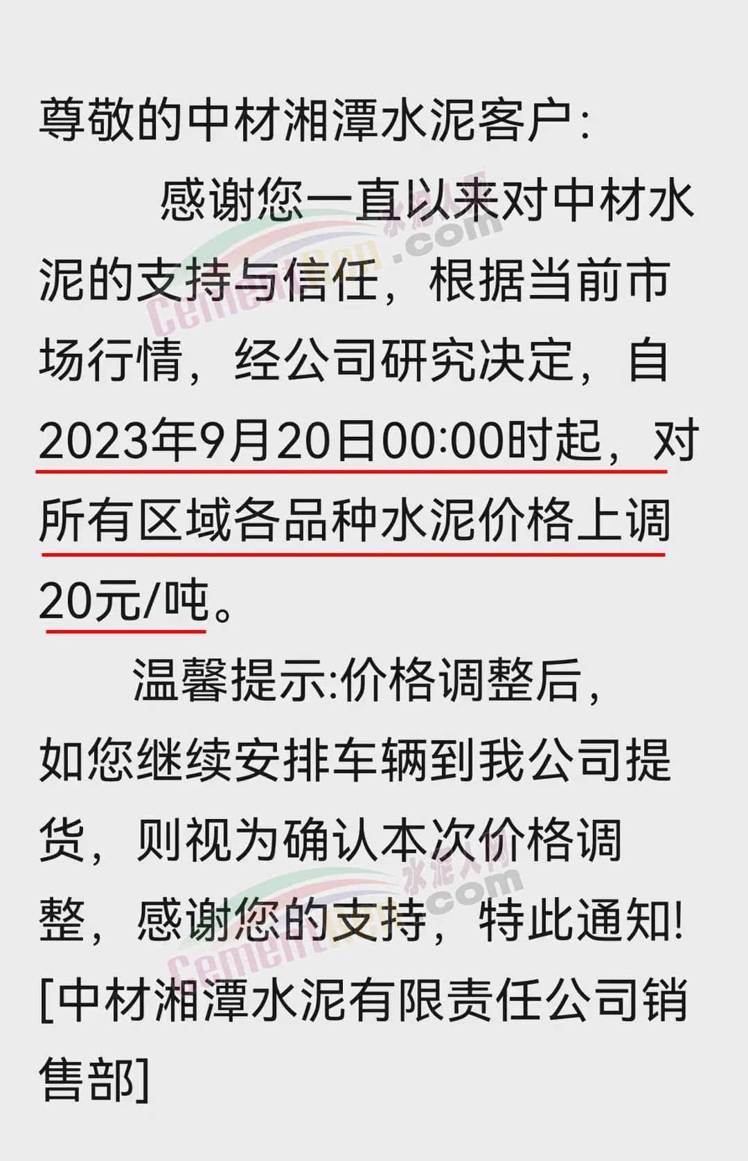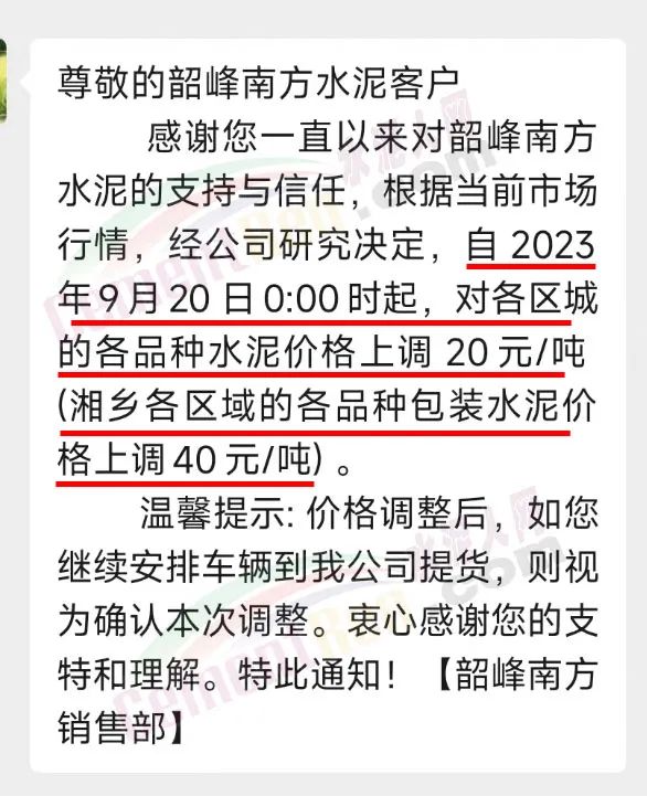 中南水泥旗下耒陽南方、寧鄉(xiāng)南方、瀏陽南方、桃江南方、坪塘南方、韶峰南方、中材湘潭水泥等多家企業(yè)通知,根據(jù)當前市場行情,經(jīng)公司研究決定,從2023年9月20日0時起,對各區(qū)域、各品種的水泥出廠價在原基礎(chǔ)上上調(diào)20~40元/噸。