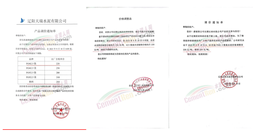 進入9月,山水水泥旗下遼寧喀左叢元號水泥分別于8日和15日兩次上調(diào)熟料報價,累計上調(diào)30元/噸。同期渤海水泥(葫蘆島)有限公司通知上調(diào)熟料報價。
