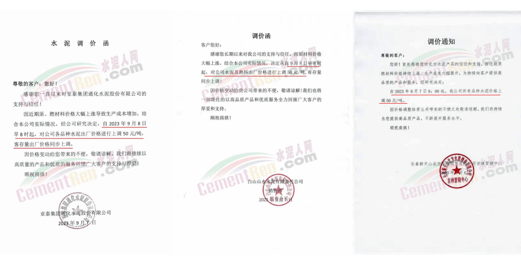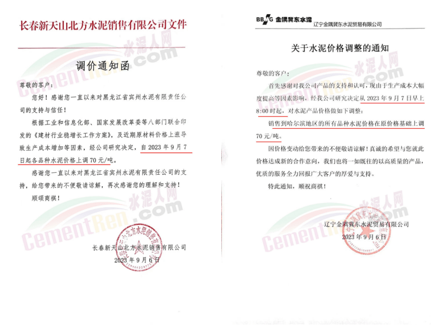9月8日,雙鴨山新時代水泥、長春新天山北方水泥龍東營銷中心伊春銷售部、三江銷售部分別通知,各品種水泥價格上調(diào)50元/噸。