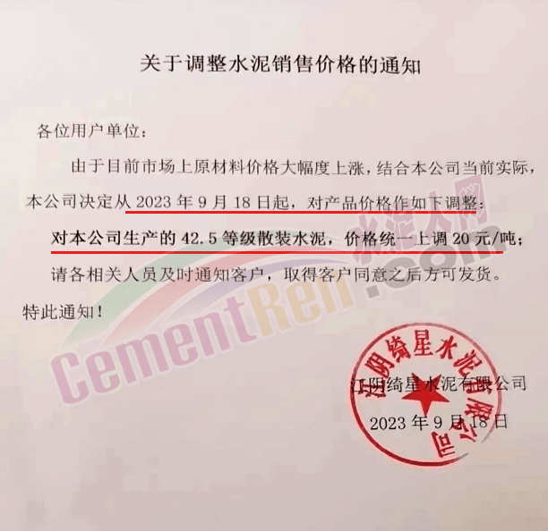 祁陽海螺水泥通知,根據(jù)當前市場形勢及公司產(chǎn)銷情況,經(jīng)研究決定自2023年9月20日8:00起對所有區(qū)域各品種水泥價格上調(diào)20元/噸。