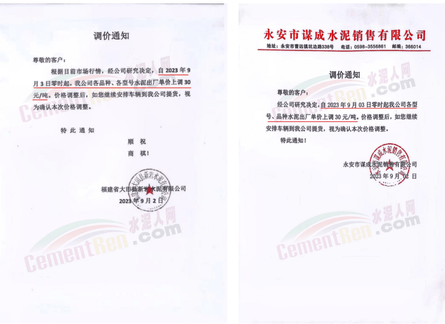 華新水泥(宜昌)公司、葛洲壩松滋水泥通知,因公司生產(chǎn)成本持續(xù)上漲,市場行情發(fā)生變化,經(jīng)公司研究決定于2023年9月20日17:00起,所有品種水泥價格上調(diào)20元/噸。