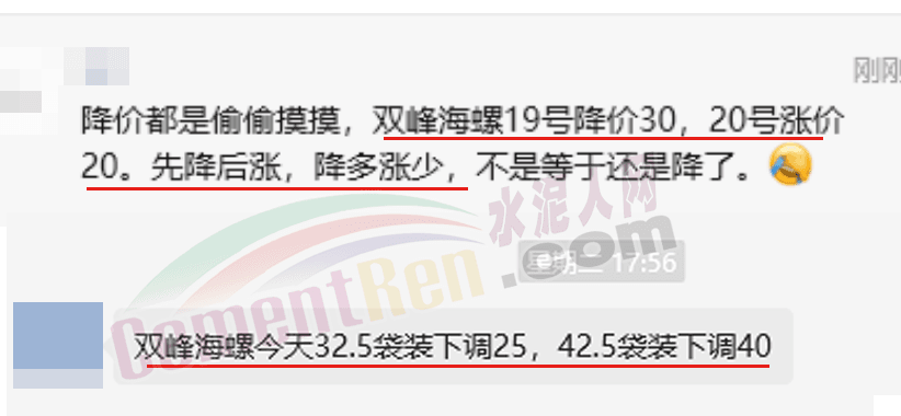當地一經銷商反饋稱,“雙峰海螺19日降價30元/噸,20日又通知漲價20元/噸。先降后漲,降多漲少,漲也是降啊!”