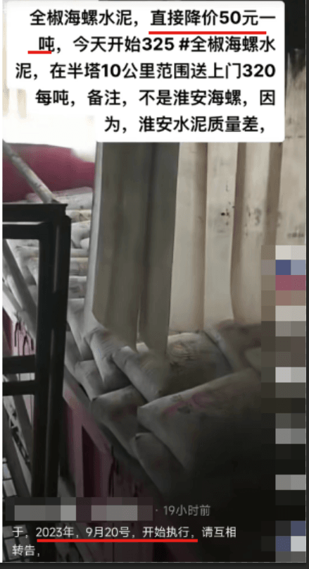 9月20日晚間,海螺水泥一經銷商發消息稱,“全椒海螺水泥直降50元/噸,自當日開始,32.5全椒海螺水泥在半塔10公里范圍內送貨上門320元/噸。并備注稱,不是淮安海螺。”
