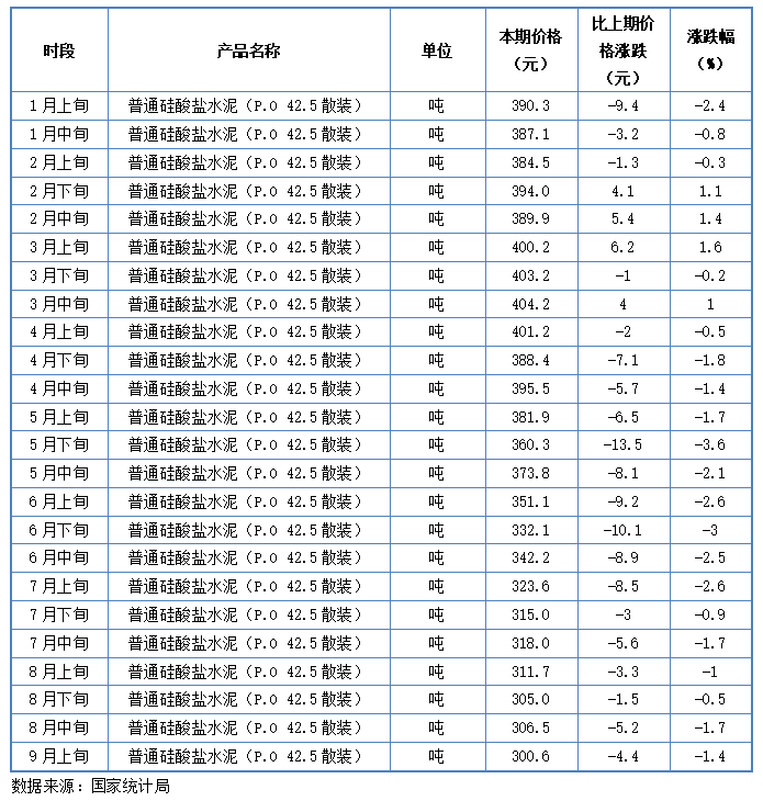 根據統計局數據顯示,9月上旬33類產品較年內低點調漲,而同期水泥價格卻持續下滑,連續半年創近5年低點紀錄。