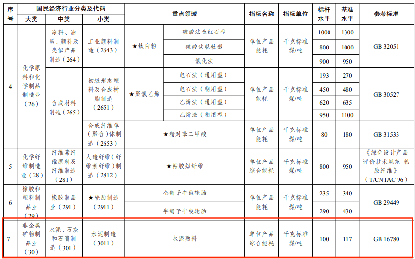 通知中對此前明確的水泥熟料等25個領域,原則上應在2025年底前完成技術改造或淘汰退出,并規定水泥熟料單位產品綜合能耗標桿水泥為100千克標準煤/噸,基準水平為117千克標準煤/噸。