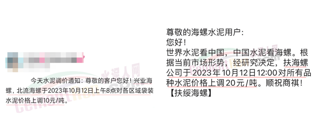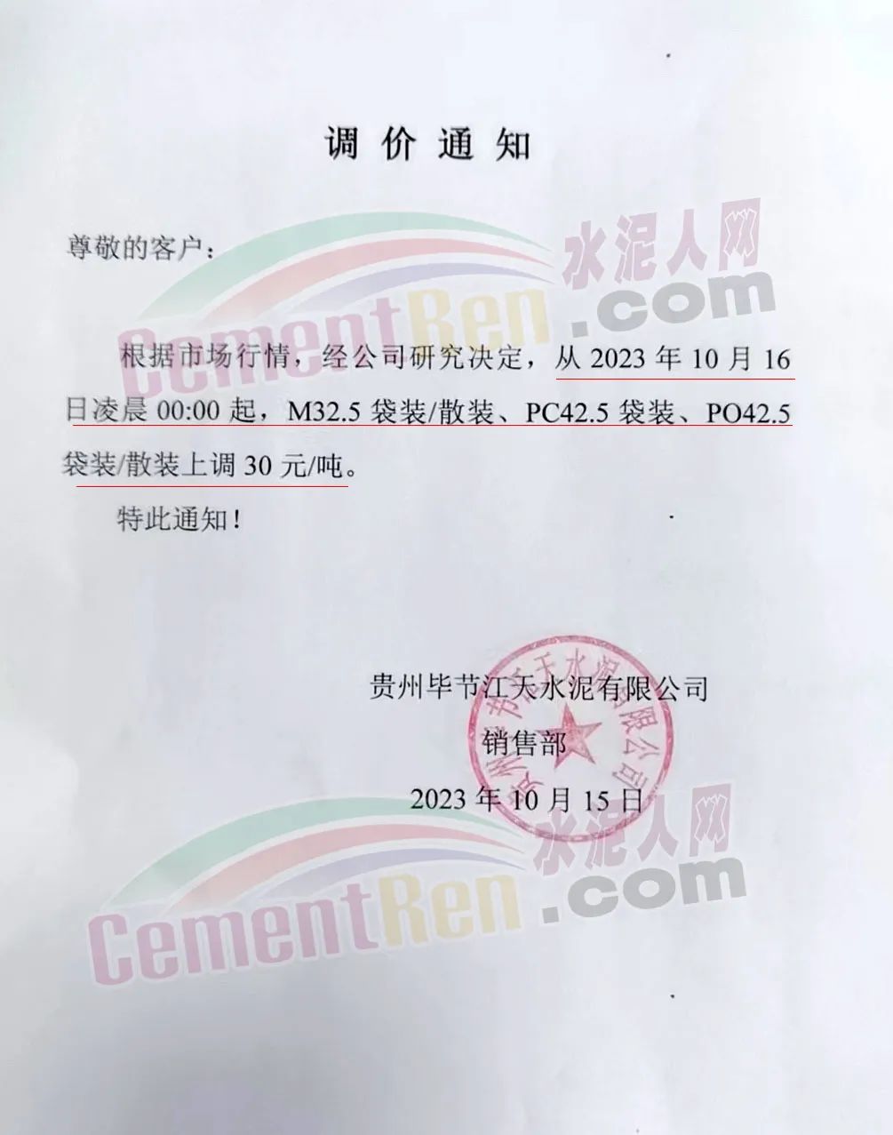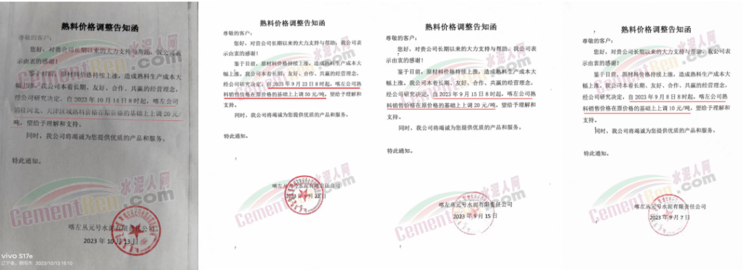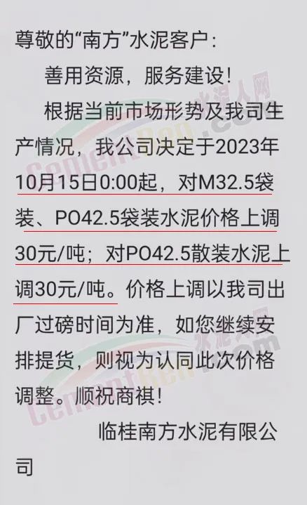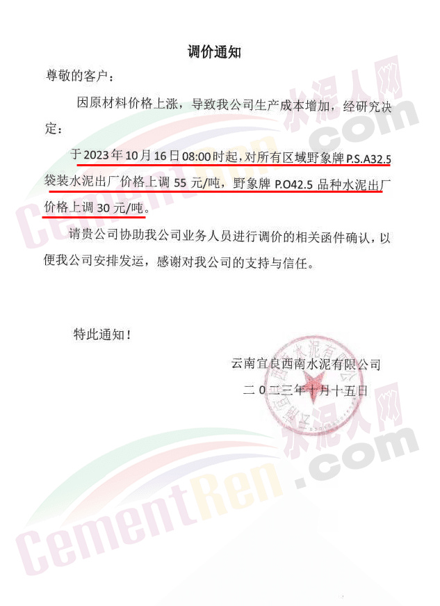 畢節(jié)賽德水泥有限公司通知,由于原材料價(jià)格持續(xù)上漲,導(dǎo)致公司生產(chǎn)成本增加,經(jīng)公司研究決定,自2023年10月16日零點(diǎn)起,對(duì)所有區(qū)域各品種水泥出廠價(jià)格在原有價(jià)格基礎(chǔ)上上調(diào)30元/噸。