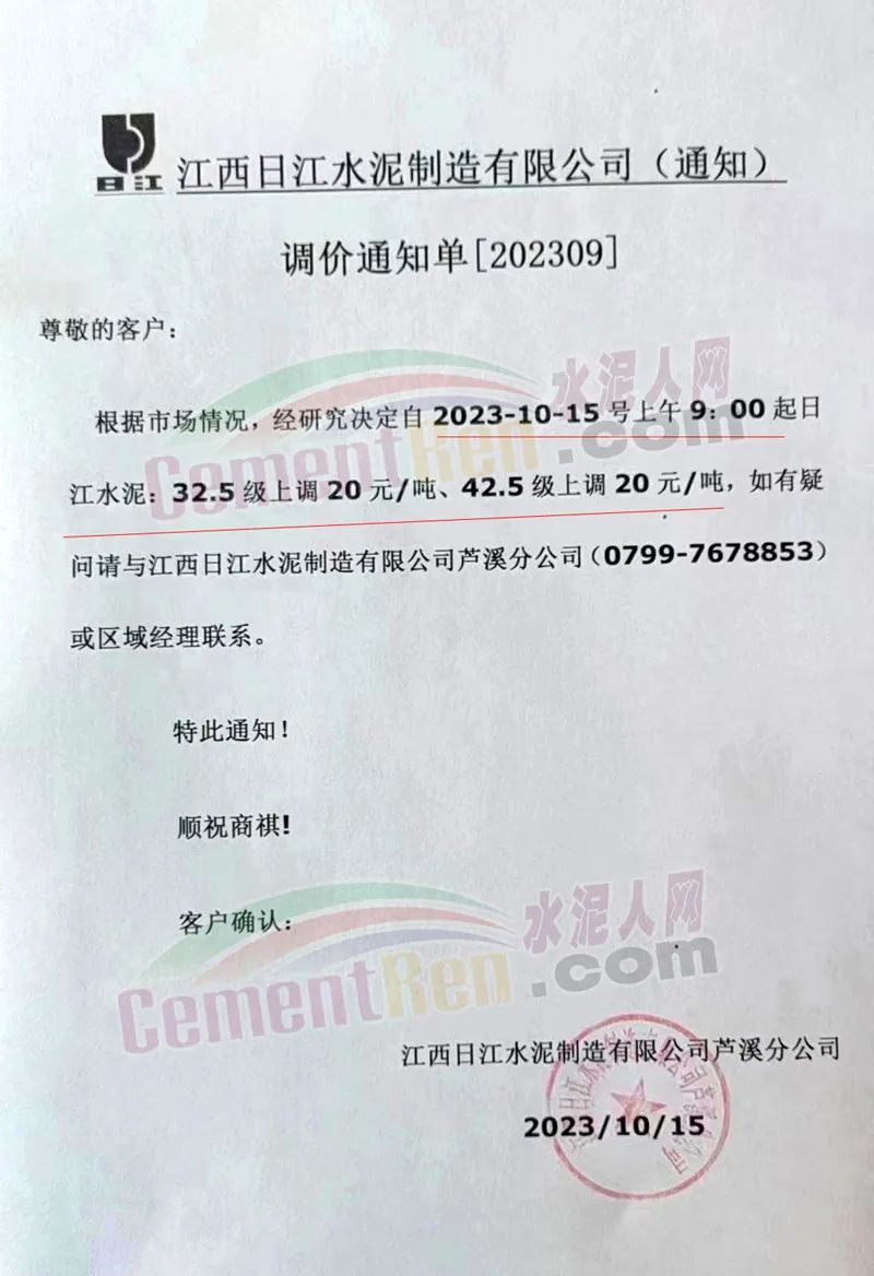 江西日江水泥制造有限公司通知,根據(jù)市場(chǎng)情況,經(jīng)研究決定自2023年10月15日上午9時(shí)起各標(biāo)號(hào)水泥價(jià)格上調(diào)20元/噸。