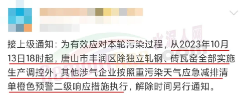 河北唐山區域通知,涉氣企業按照重污染天氣應急減排清單橙色預警二級響應措施執行。