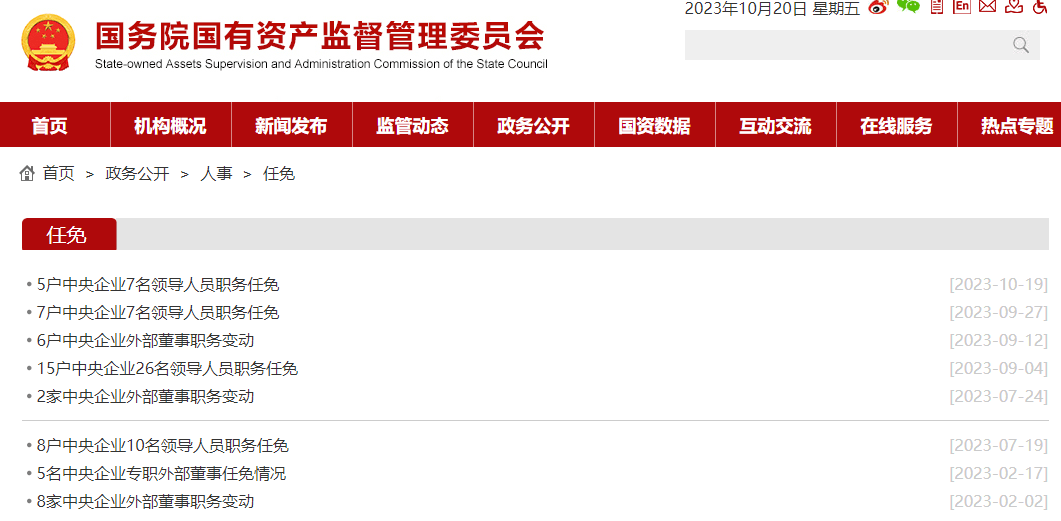 近期,國資委網(wǎng)站連發(fā)多條央企人事變動(dòng)消息。截至目前,年內(nèi)央企人事變動(dòng)已經(jīng)涉及56戶企業(yè),多位領(lǐng)導(dǎo)到年齡退休。