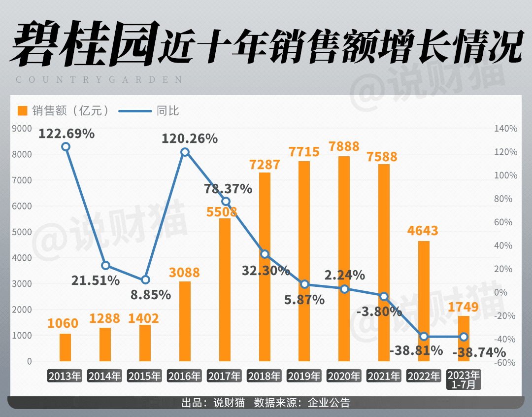 碧桂園近幾年房產售價持續下滑,僅2020到2022年,碧桂園全國折合均價持續下降,分別為8402元/平方米、8033元/平方米、7886元/平方米,但2022年,碧桂園銷售額仍然大跌38.81%,減少了近3000億,交出了并不完美的答卷。2023年上半年更是巨虧514.61億,可謂是生存艱難。