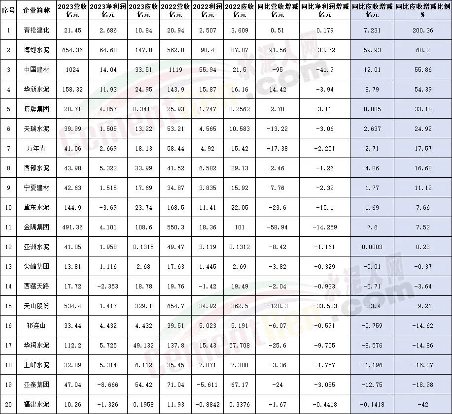 今年上半年各企業公布的半年報可見,20家上市企業中12家應收賬款增加,占比達60%。其中海螺水泥2023年上半年同比2022年同期應收賬款及票據增加59.93億元,增幅達68.2%。同期營業收入增加91.56億元,凈利潤減少33.72億元,增收不增利的情況明顯。