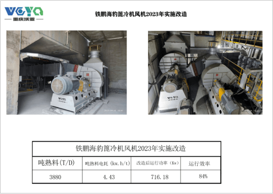 3.運行效率提高:改造后,篦冷機風機的運行效率達到了84%。這表明設備的性能得到了顯著提升,生產過程更為高效,減少了資源的浪費。
